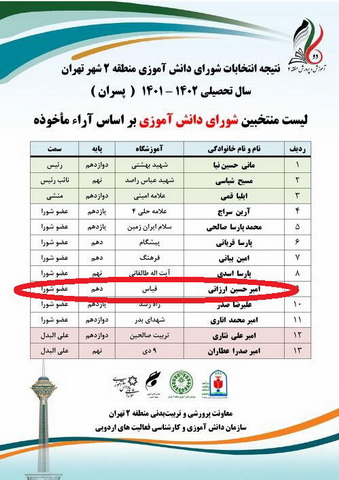 طی جلسه شورای دانش آموزی که در اداره آموزش و پرورش منطقه ۲ تهران با حضور ریاست محترم اداره آموزش و پرورش منطقه ۲ تهران برگزار شد، دانش آموز دبیرستان دوره دوم پسرانه قیاس، جناب آقای امیرحسین ارزانی با کسب آرای شرکت کنندگان، به عنوان عضو شورای دانش آموزی منطقه ۲ تهران انتخاب شد.