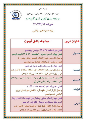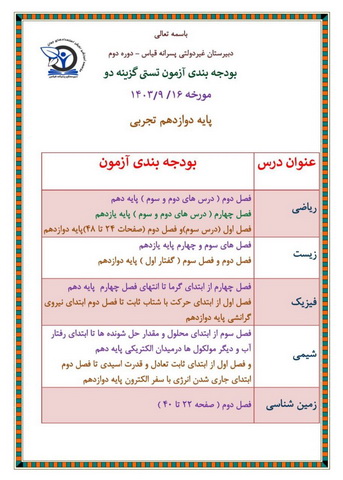 طبق اعلام قبلی ، سومین آزمون تستی گزینه دو دانش آموزان عزیز دوازدهم ،روز جمعه مورخه ۱۶ آذرماه ۱۴۰۳ برگزار خواهد شد.