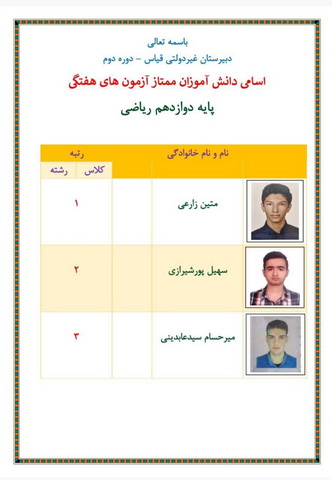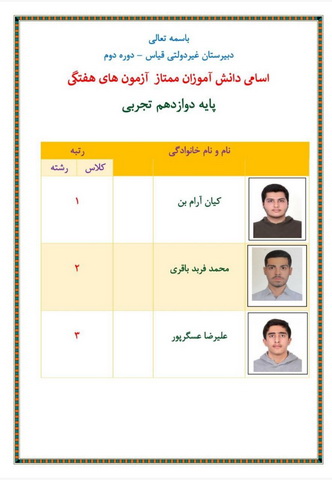 اسامی دانش آموزان ممتاز در دومین آزمون تستی گزینه دو روز جمعه مورخه 11/۸/1403 با توجه به تراز کسب شده به شرح ذیل می باشد.